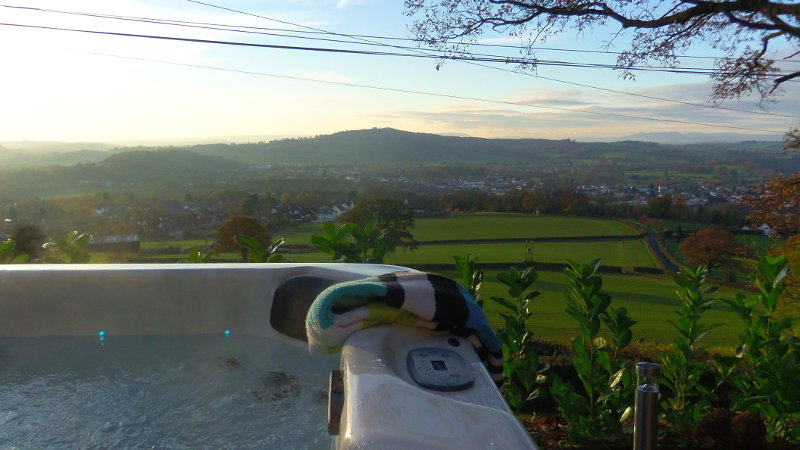 The hot tub is located in the lower garden. The view from our hot tub is stunning! While soaking in the hot tub you can enjoy the views of the Wye Valley and in the distance Sugar Loaf mountain and the hills of the South Wales.